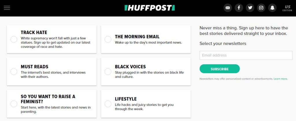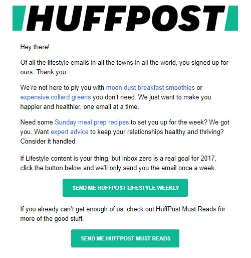 This is the basis for any successful email marketing campaign. Huffington Post set the bar high with its multitude of subscription options. The follow up email offer even more control to subscribers.
