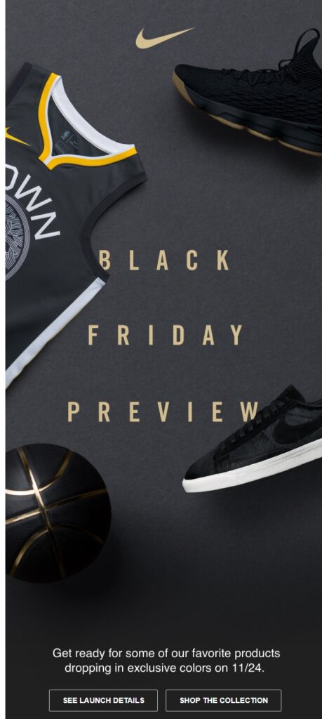 Nike’s “Just Do It” motto is a key part of its brand and the email is reflective of this. It simply says “Black Friday Preview” with a few enticing images of apparel around the edge.