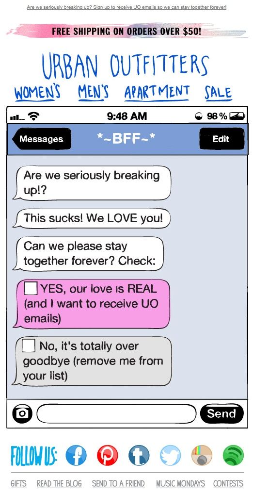 The tone should be personable and friendly, even if your subscribers decide to leave your list. Look at how Urban Outfitter takes a creative approach in trying to win them back.