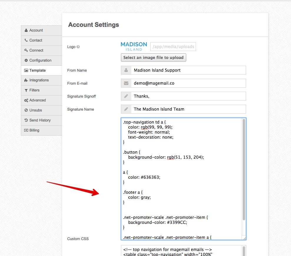 If you’d like to manually modify the CSS for your email, you can do that in Settings > Template > Custom CSS.