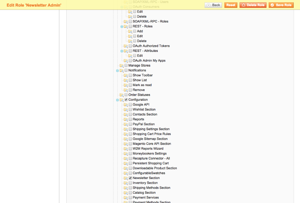 In order to create a user role that has access to the MageMail configuration, you’ll need to give access to System > Configuration > Newsletter Section: