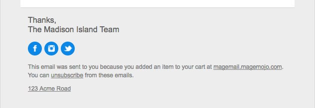 - Signoff – The “Thanks, The Madison Islands Team” can be customized under Settings > Template and can also be overridden on an individual email trigger basis in the Sender settings.