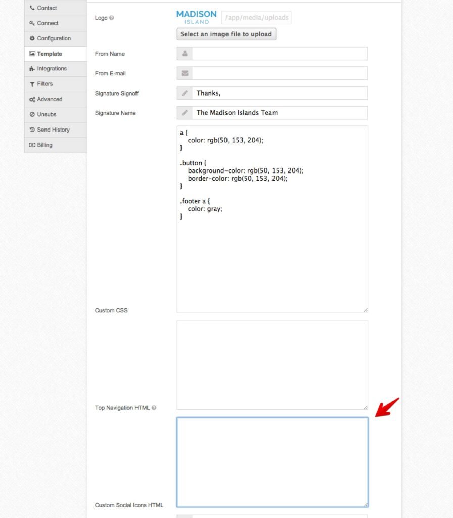 If you want to use custom markup / images for the social media icons in the footer of the email, here’s how you can do that. You can drop the custom markup under Settings > Template > Custom Social Icons HTML: