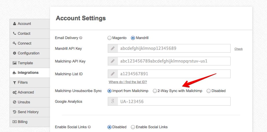 It will import roughly 1k to 2k unsubscribes every hour until it grabs all of them. If you would like to also export your MageMail unsubscribes to Mailchimp (i.e. a 2 way sync), you can enable that here: