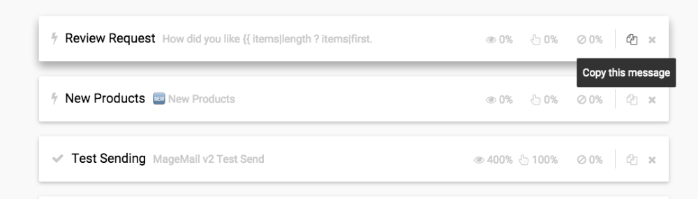 In order to copy or duplicate an existing message, just click the copy icon in the message list: