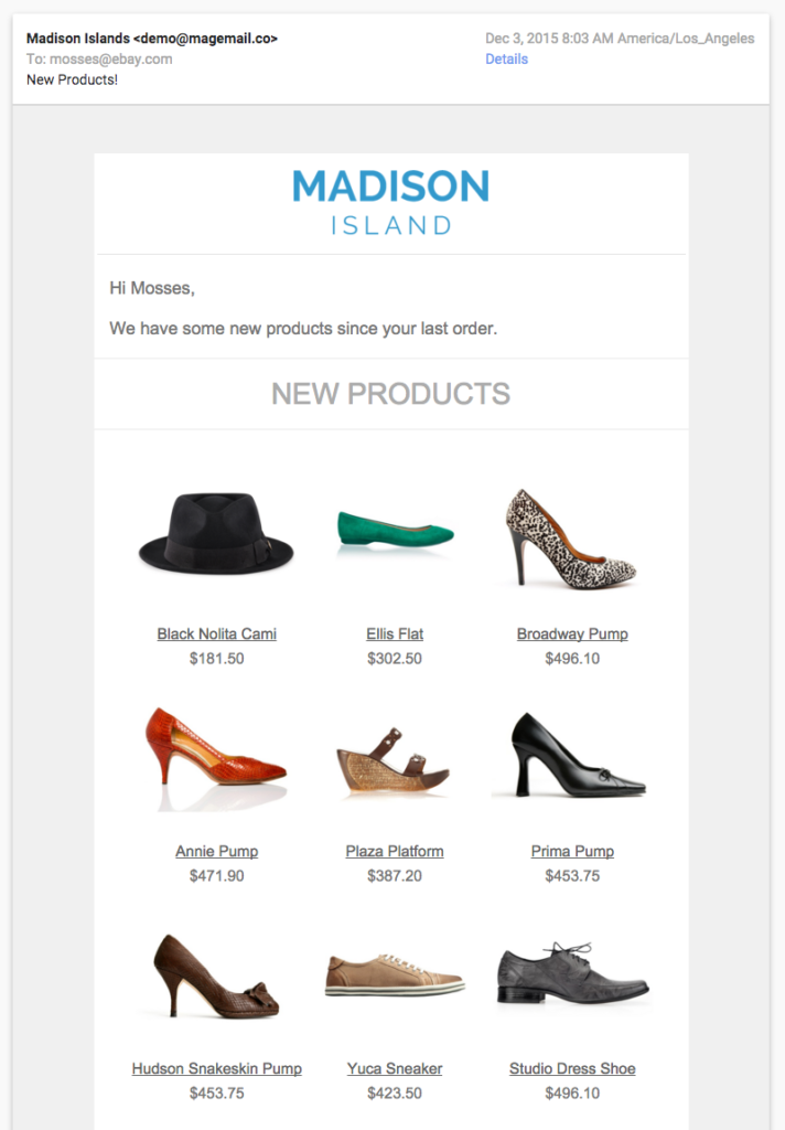 You can send out new products to customers automatically using the New Products trigger. It will automatically pull in new products from Magento (that are active and visible), and show them in order of newest products at the top.