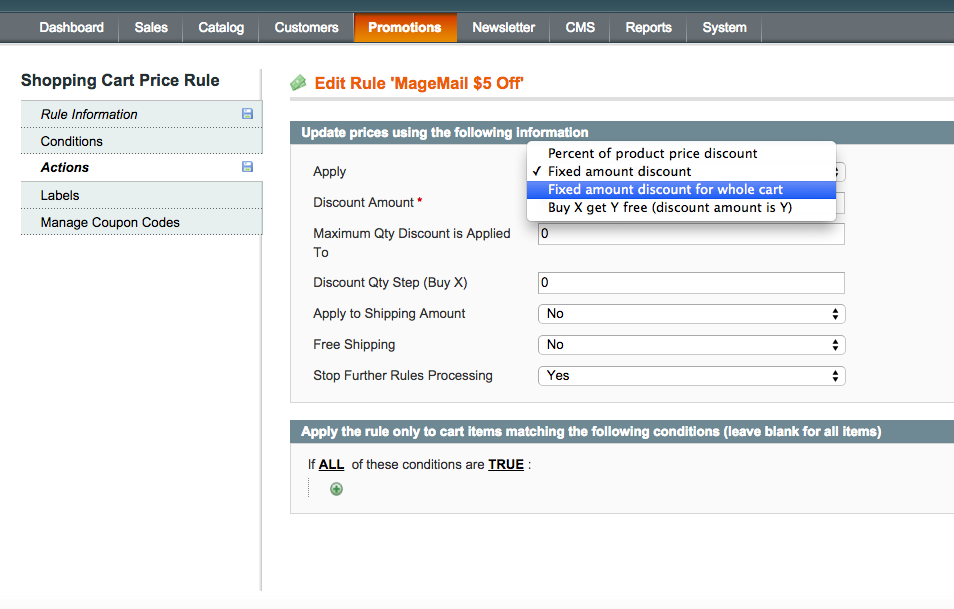 If you’ve setup a shopping cart price rule with a fixed amount discount (i.e. $5 off), one of the common mistakes that we’ve seen is using Fixed amount discount instead of Fixed amount discount for whole cart.