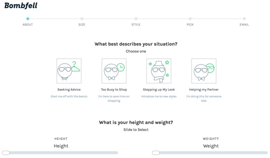 Check out Bombfell’s advanced signup form. A lot more information is required so their stylists can pick the right clothes for their customers. From height, weight, preferred style and much more.