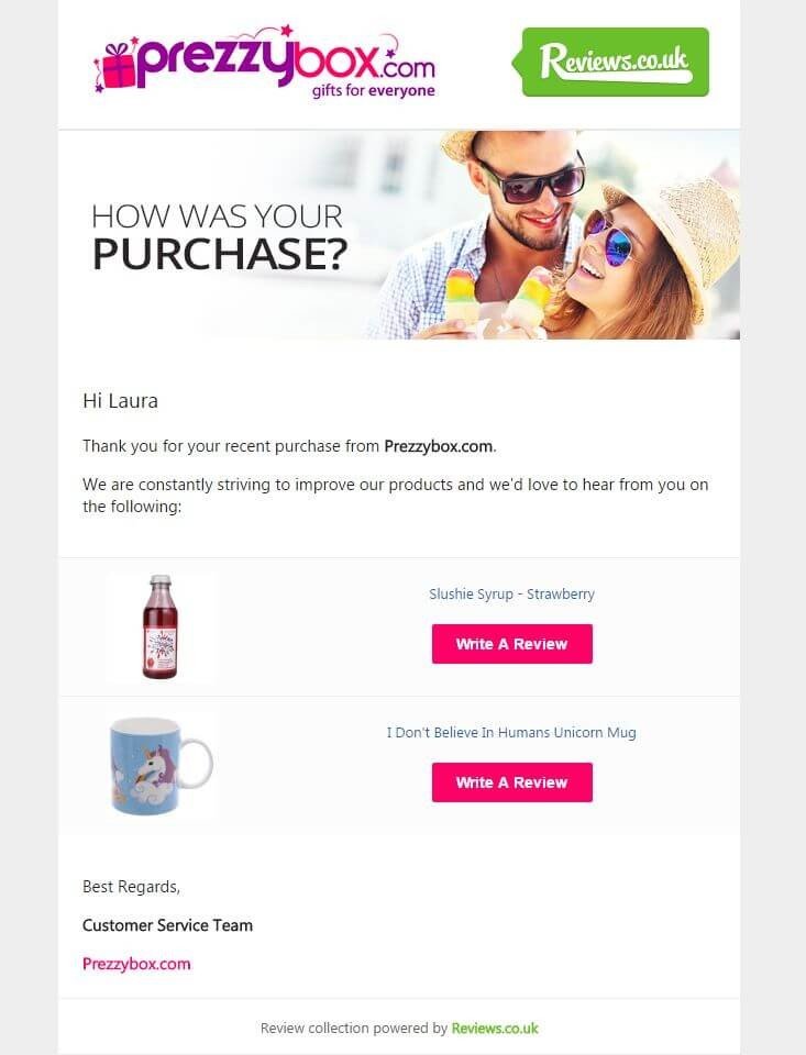 Here’s a post-purchase email by Prezzybox showing how they used the signup form (for the name) and purchase history (for the products) to craft this winning email: