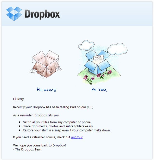 Here’s another behavior triggered email by Dropbox where they target customers who haven’t downloaded their app onto their computer yet. Most likely the email is sent a number of days or months after signing up. Notice in their unique copy: